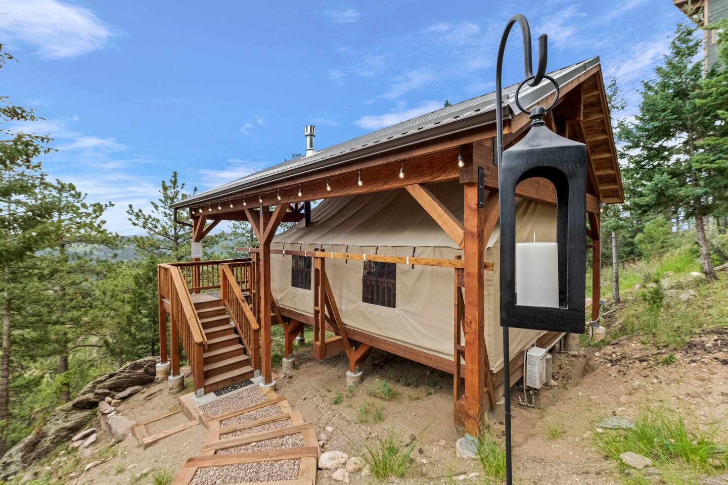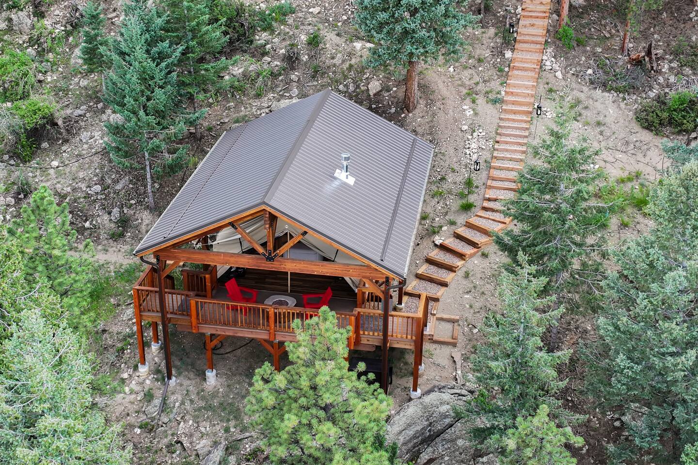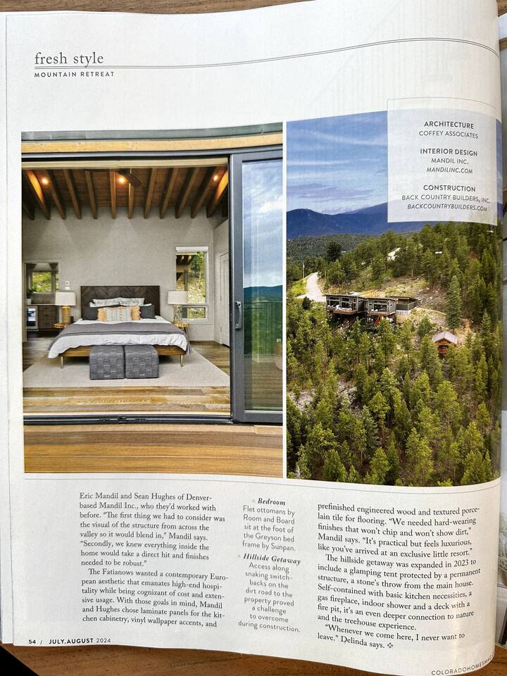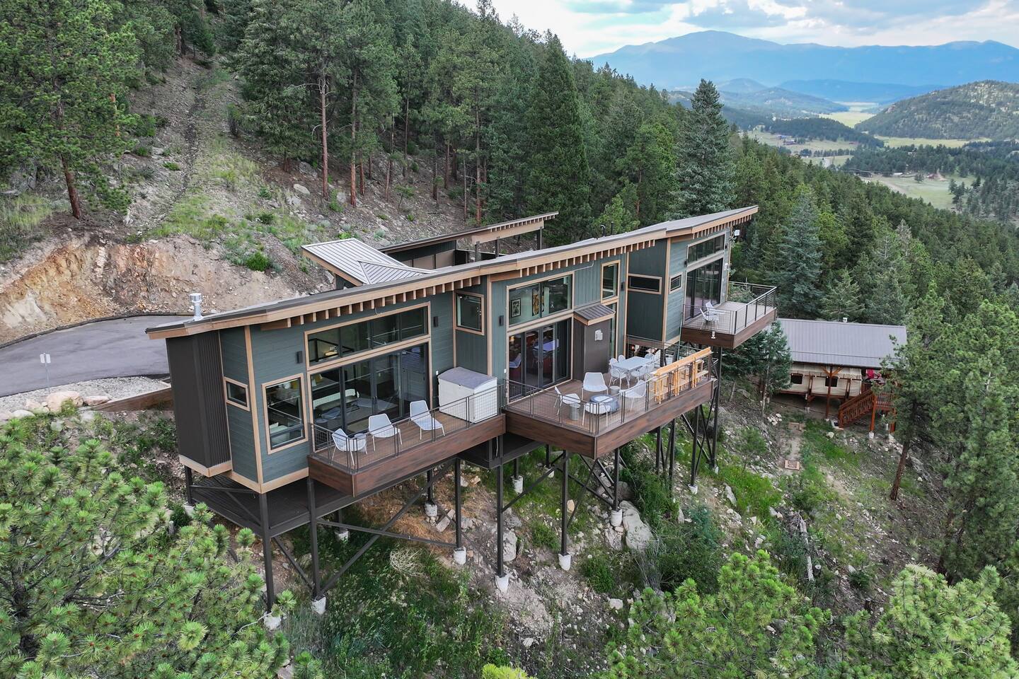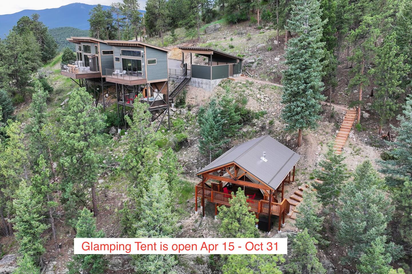 Note: The main house has two bedrooms and two bathrooms and is available year round. The Glamping Tent (the third bedroom and third bathroom) is available from April 15 until October 31 each year. During the open days in April and October, the shower will not be operable and the sink will use bottled water instead of the faucet due to the risk of freezing during these months. The waterless dry flush toilet will be available at all times. Venture to the vibrant forests of colorful Colorado when you book this luxury treehouse + glamping tent that sleeps up to eight in Bailey. Perched on the side of a mountain overlooking Deer Creek Valley, this home provides incredible views both inside through the floor-to-ceiling windows and outside on the three huge decks. Whether you're visiting for a quiet weekend in the woods or a family ski trip to the nearby Breckenridge resort, this mountain cabin is sure to be the perfect home base! This is a LUXURY treehouse - one of a kind in the United States, if not the world that sleeps 8 between the treehouse and the new for 2023 glamping tent! Two bedrooms and two bathrooms with nearly 1,600 square feet of luxurious furnishings and finishes with nearly 1,000 square feet of deck space to enjoy the beautiful outdoors and scenery of Colorado. Plus new for 2023 starting May 1st, we added a 320 square foot luxury glamping tent featuring a gas fireplace, king bed, luxury mattress and linens, coffee maker, fridge, toilet, sink and shower! It also has a front deck with two Adirondack chairs and a fire pit - and the best view of any glamping tent we know about! Why book a stay at the Zen Treehouse? When we saw the #1 Airbnb property a few years ago was a small treehouse in suburban Atlanta Georgia, we thought we could do better...and Zen Treehouse is the result! The vision was to create a luxury escape from the stressors of the world, where people could go to relax and enjoy nature and the many amazing luxury amenities that Zen Treehouse offers - a professionally designed interior and exterior space that is luxurious, spacious and comforting. Enter the drive with a secure, coded driveway gate that, when it shuts behind you, represents shutting out the rest of the world and soaking in the amazing feeling that you get when you visit Zen Treehouse. Relax by one of the two exterior fire pits on one of the four large decks the house offers. The main deck also provides an outdoor dining space for six with amazing views over Deer Creek Valley - from the back decks, you look out over a forest of trees for miles and miles. The newly completed (opened May 1st 2023) Zen Glamping Tent sleeps two in true "glamping not camping" luxury. King bed, fine bedding, gas stove/fireplace for ambiance and warmth, bathroom with toilet, sink and shower, and coffee and water bar. The deck features two Adirondack chairs, a fire pit, and beautiful views over the valley. We also have a corn hole set up outside the tent for you to enjoy. ***New August 15, 2024 - New evaporative coolers for each of the two bedrooms and the main living area of the Treehouse. Summers are getting warmer in Colorado, so we just added these for the warmer summer months.*** Our base price is for up to six guests. Additional guests--up to eight total April through October--require an additional fee of $50/person/stay (collected after guest count is confirmed at booking). The base price is adjusted in the winter months since the house can only accommodate six. There is nothing like this home anywhere in Colorado! Enjoy an afternoon or evening by the party deck where you can hot tub, enjoy the barrel sauna, grill some steak, drink some wine, and converse around the fire pit, all the while enjoying the stunning views of Deer Creek Valley. When it's time to go to sleep, enjoy your own Sonos system in the bedroom where you can play relaxing sleep music and enjoy the warmth of the fireplace while you sip some tea or enjoy a glass of wine before bed. Then, flip a switch and all the windows in your bedroom close with blackout roller shades - only to be opened again when you are ready in the morning. Relax with us for a few days...you'll be glad you did! Amazing views over Deer Creek Valley - from the back decks, you look out over a forest of trees for miles and miles. There is nothing like this home anywhere in Colorado! Enjoy an afternoon or evening by the relaxation deck where you can hot tub, enjoy the barrel sauna, grill some steak, drink some wine, and converse around the fire pit, all the while enjoying the stunning views of Deer Creek Valley. The Zen Treehouse is only one hour from downtown Denver and only an hour and 10 minutes from downtown Boulder or Denver International Airport. The only part of the drive that is on a dirt road is the last five minutes. This is where an all-wheel or four-wheel drive vehicle is highly recommended. There are somewhat steep switchbacks that will take you, in those last five minutes, to the gate of Zen Treehouse, where luxury and relaxation await. This is a pet-friendly property that does require a non-refundable pet fee of $150 per animal. We also charge a $350 refundable deposit per dog (for up to 2 large or 3 small dogs) for stays at Zen Treehouse. This deposit is refunded within 2 weeks of departure if the cleaning is not excessive--beyond what is expected by the number of dogs staying--AND if no damages occur. The most common damages that result in forfeiture of deposit are scratches to the doors, door frames and walls, damages to screens, and lack of cleaning up after the dog(s). The best way to avoid these types of damages is to not close dogs into rooms or the house (if you are leaving), and if you do plan to leave your dog(s) at the house, having a kennel/kennels there is highly recommended. For damages, we pay our property manager for the time it takes to gather photos, contact guests, file claims with the booking platforms, and coordinate repairs, and we pay our contractor(s) 