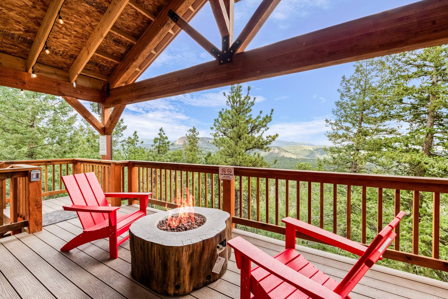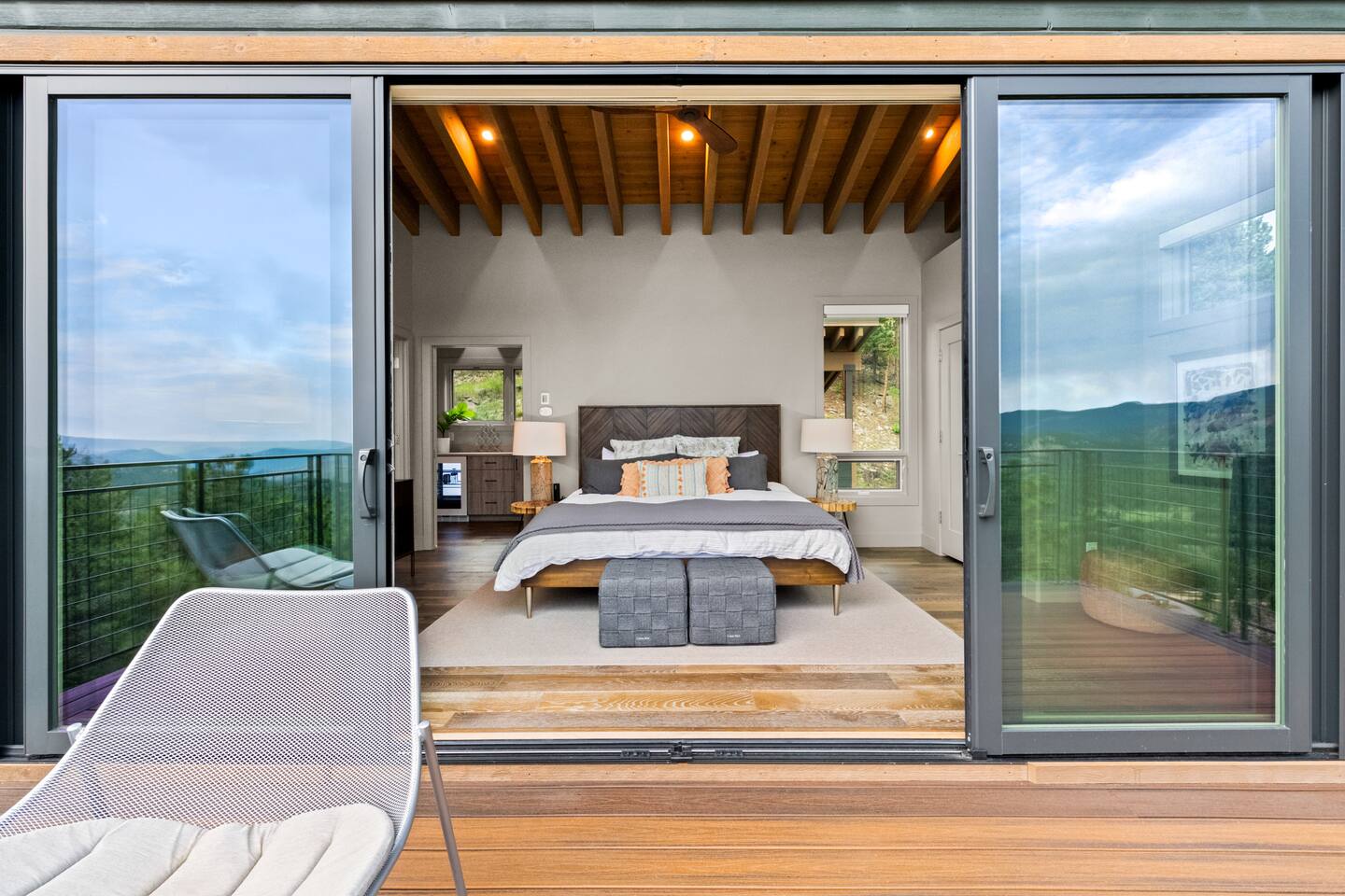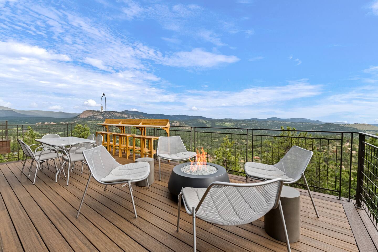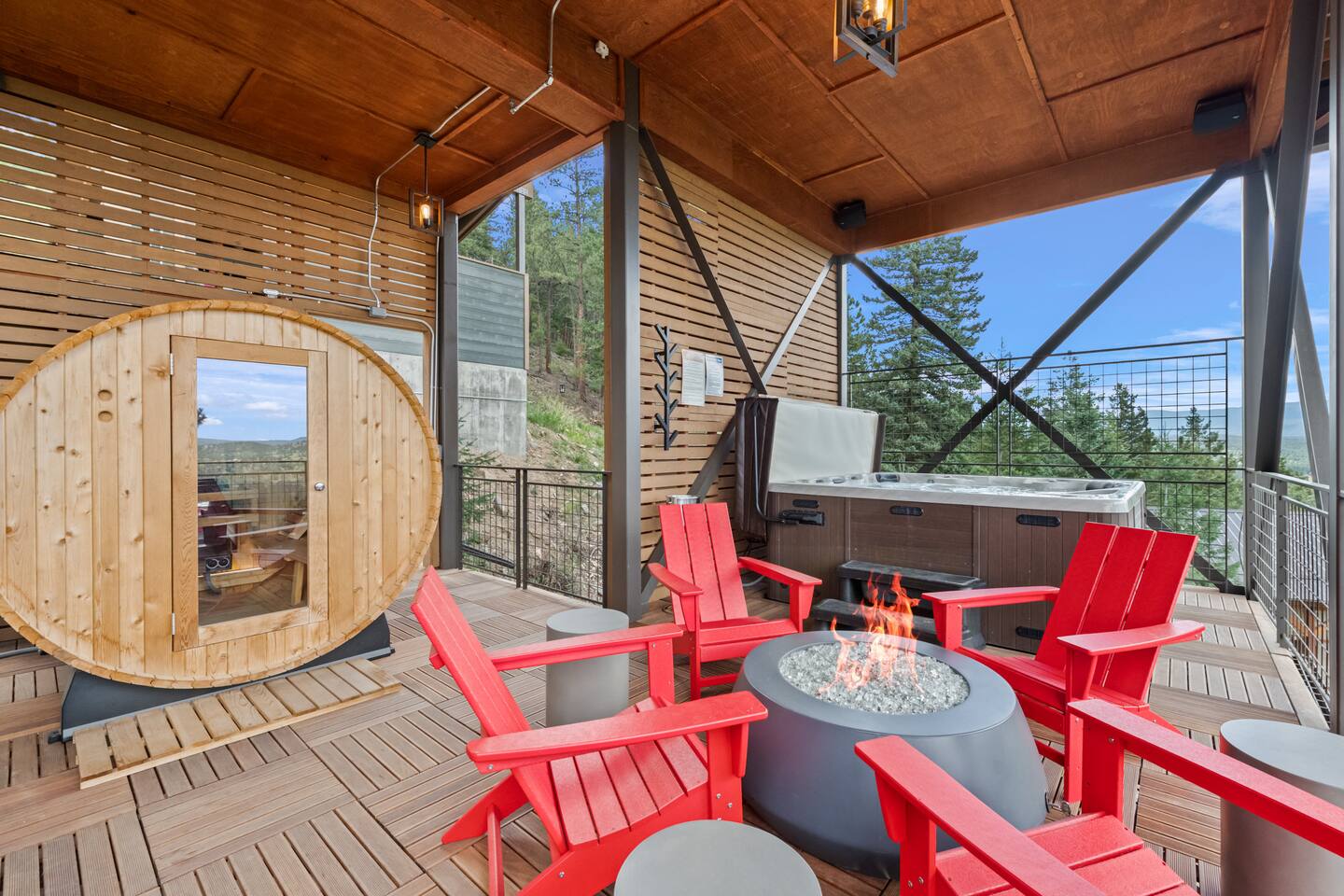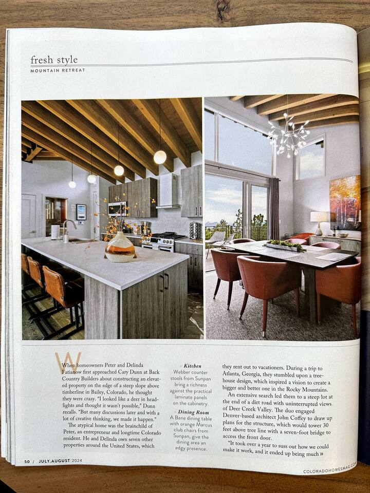 Note: The main house has two bedrooms and two bathrooms and is available year round. The Glamping Tent (the third bedroom and third bathroom) is available from April 15 until October 31 each year. During the open days in April and October, the shower will not be operable and the sink will use bottled water instead of the faucet due to the risk of freezing during these months. The waterless dry flush toilet will be available at all times. Venture to the vibrant forests of colorful Colorado when you book this luxury treehouse + glamping tent that sleeps up to eight in Bailey. Perched on the side of a mountain overlooking Deer Creek Valley, this home provides incredible views both inside through the floor-to-ceiling windows and outside on the three huge decks. Whether you're visiting for a quiet weekend in the woods or a family ski trip to the nearby Breckenridge resort, this mountain cabin is sure to be the perfect home base! This is a LUXURY treehouse - one of a kind in the United States, if not the world that sleeps 8 between the treehouse and the new for 2023 glamping tent! Two bedrooms and two bathrooms with nearly 1,600 square feet of luxurious furnishings and finishes with nearly 1,000 square feet of deck space to enjoy the beautiful outdoors and scenery of Colorado. Plus new for 2023 starting May 1st, we added a 320 square foot luxury glamping tent featuring a gas fireplace, king bed, luxury mattress and linens, coffee maker, fridge, toilet, sink and shower! It also has a front deck with two Adirondack chairs and a fire pit - and the best view of any glamping tent we know about! Why book a stay at the Zen Treehouse? When we saw the #1 Airbnb property a few years ago was a small treehouse in suburban Atlanta Georgia, we thought we could do better...and Zen Treehouse is the result! The vision was to create a luxury escape from the stressors of the world, where people could go to relax and enjoy nature and the many amazing luxury amenities that Zen Treehouse offers - a professionally designed interior and exterior space that is luxurious, spacious and comforting. Enter the drive with a secure, coded driveway gate that, when it shuts behind you, represents shutting out the rest of the world and soaking in the amazing feeling that you get when you visit Zen Treehouse. Relax by one of the two exterior fire pits on one of the four large decks the house offers. The main deck also provides an outdoor dining space for six with amazing views over Deer Creek Valley - from the back decks, you look out over a forest of trees for miles and miles. The newly completed (opened May 1st 2023) Zen Glamping Tent sleeps two in true "glamping not camping" luxury. King bed, fine bedding, gas stove/fireplace for ambiance and warmth, bathroom with toilet, sink and shower, and coffee and water bar. The deck features two Adirondack chairs, a fire pit, and beautiful views over the valley. We also have a corn hole set up outside the tent for you to enjoy. ***New August 15, 2024 - New evaporative coolers for each of the two bedrooms and the main living area of the Treehouse. Summers are getting warmer in Colorado, so we just added these for the warmer summer months.*** Our base price is for up to six guests. Additional guests--up to eight total April through October--require an additional fee of $50/person/stay (collected after guest count is confirmed at booking). The base price is adjusted in the winter months since the house can only accommodate six. There is nothing like this home anywhere in Colorado! Enjoy an afternoon or evening by the party deck where you can hot tub, enjoy the barrel sauna, grill some steak, drink some wine, and converse around the fire pit, all the while enjoying the stunning views of Deer Creek Valley. When it's time to go to sleep, enjoy your own Sonos system in the bedroom where you can play relaxing sleep music and enjoy the warmth of the fireplace while you sip some tea or enjoy a glass of wine before bed. Then, flip a switch and all the windows in your bedroom close with blackout roller shades - only to be opened again when you are ready in the morning. Relax with us for a few days...you'll be glad you did! Amazing views over Deer Creek Valley - from the back decks, you look out over a forest of trees for miles and miles. There is nothing like this home anywhere in Colorado! Enjoy an afternoon or evening by the relaxation deck where you can hot tub, enjoy the barrel sauna, grill some steak, drink some wine, and converse around the fire pit, all the while enjoying the stunning views of Deer Creek Valley. The Zen Treehouse is only one hour from downtown Denver and only an hour and 10 minutes from downtown Boulder or Denver International Airport. The only part of the drive that is on a dirt road is the last five minutes. This is where an all-wheel or four-wheel drive vehicle is highly recommended. There are somewhat steep switchbacks that will take you, in those last five minutes, to the gate of Zen Treehouse, where luxury and relaxation await. This is a pet-friendly property that does require a non-refundable pet fee of $150 per animal. We also charge a $350 refundable deposit per dog (for up to 2 large or 3 small dogs) for stays at Zen Treehouse. This deposit is refunded within 2 weeks of departure if the cleaning is not excessive--beyond what is expected by the number of dogs staying--AND if no damages occur. The most common damages that result in forfeiture of deposit are scratches to the doors, door frames and walls, damages to screens, and lack of cleaning up after the dog(s). The best way to avoid these types of damages is to not close dogs into rooms or the house (if you are leaving), and if you do plan to leave your dog(s) at the house, having a kennel/kennels there is highly recommended. For damages, we pay our property manager for the time it takes to gather photos, contact guests, file claims with the booking platforms, and coordinate repairs, and we pay our contractor(s) 