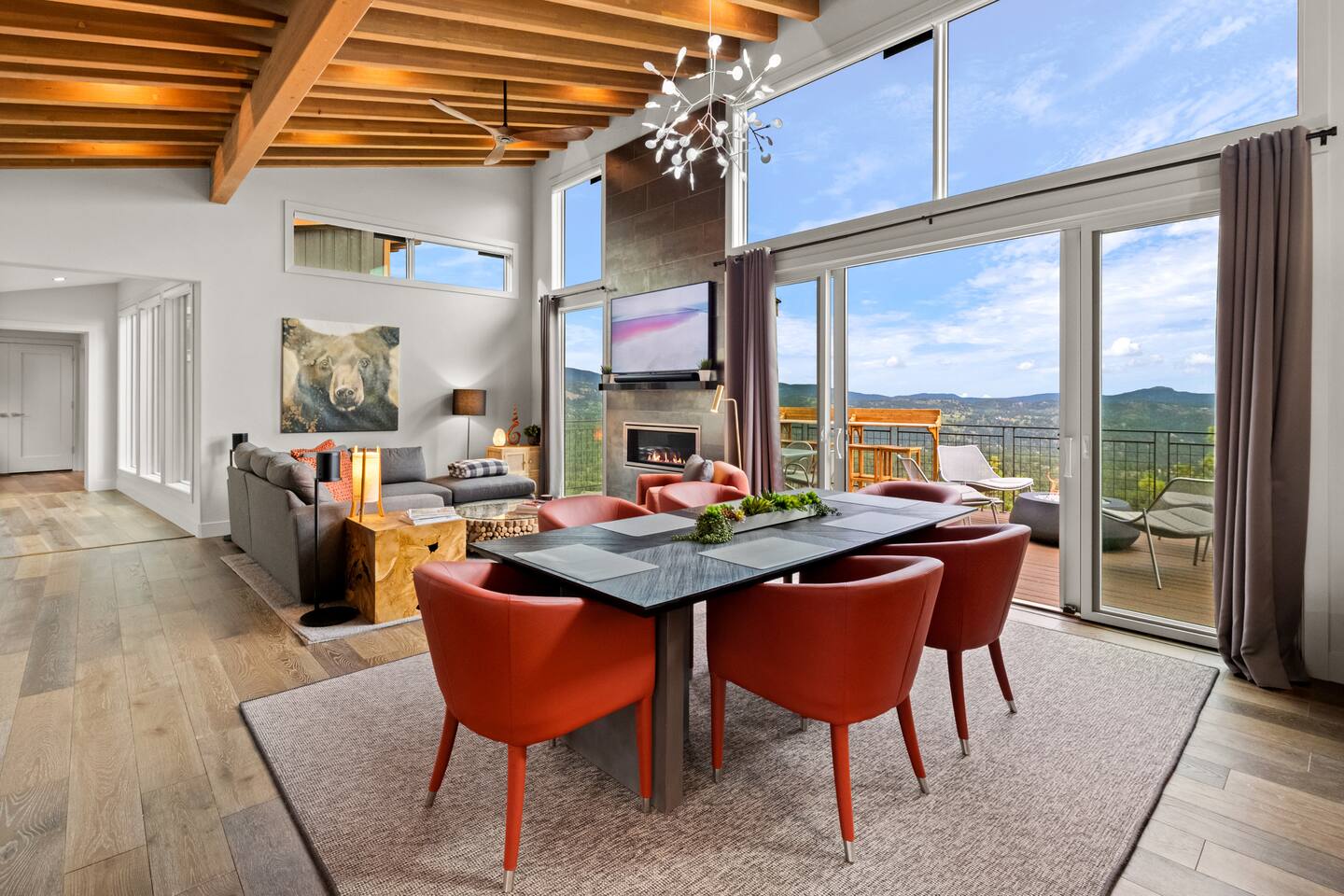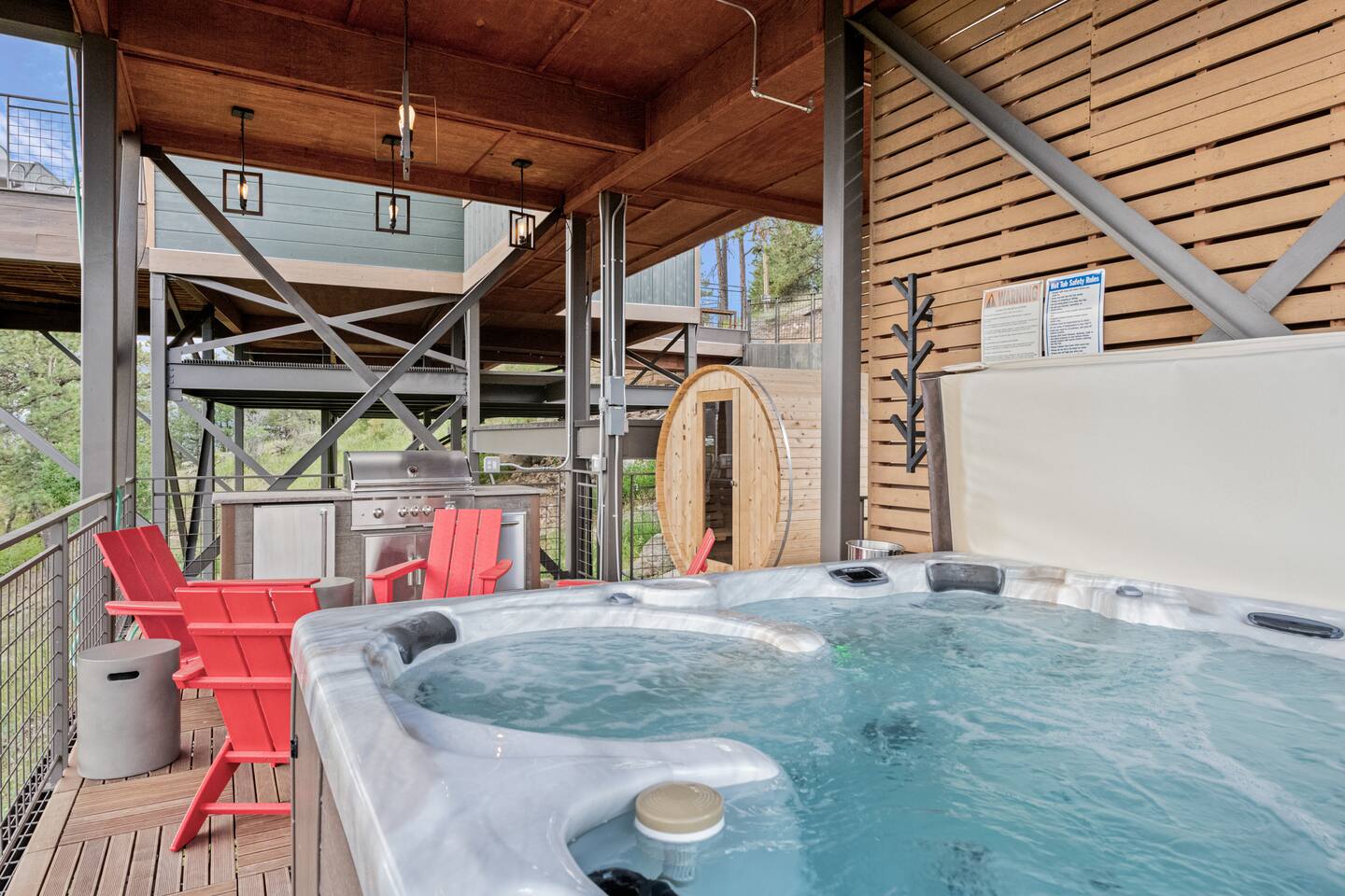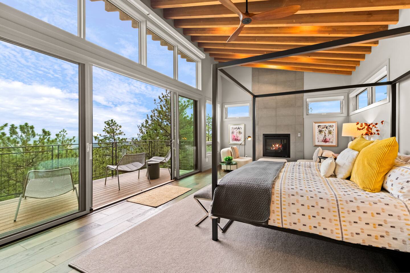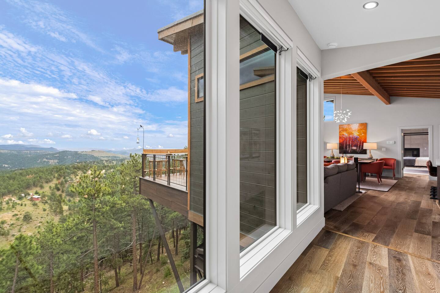 Note: The main house has two bedrooms and two bathrooms and is available year round. The Glamping Tent (the third bedroom and third bathroom) is available from April 15 until October 31 each year. During the open days in April and October, the shower will not be operable and the sink will use bottled water instead of the faucet due to the risk of freezing during these months. The waterless dry flush toilet will be available at all times. Venture to the vibrant forests of colorful Colorado when you book this luxury treehouse + glamping tent that sleeps up to eight in Bailey. Perched on the side of a mountain overlooking Deer Creek Valley, this home provides incredible views both inside through the floor-to-ceiling windows and outside on the three huge decks. Whether you're visiting for a quiet weekend in the woods or a family ski trip to the nearby Breckenridge resort, this mountain cabin is sure to be the perfect home base! This is a LUXURY treehouse - one of a kind in the United States, if not the world that sleeps 8 between the treehouse and the new for 2023 glamping tent! Two bedrooms and two bathrooms with nearly 1,600 square feet of luxurious furnishings and finishes with nearly 1,000 square feet of deck space to enjoy the beautiful outdoors and scenery of Colorado. Plus new for 2023 starting May 1st, we added a 320 square foot luxury glamping tent featuring a gas fireplace, king bed, luxury mattress and linens, coffee maker, fridge, toilet, sink and shower! It also has a front deck with two Adirondack chairs and a fire pit - and the best view of any glamping tent we know about! Why book a stay at the Zen Treehouse? When we saw the #1 Airbnb property a few years ago was a small treehouse in suburban Atlanta Georgia, we thought we could do better...and Zen Treehouse is the result! The vision was to create a luxury escape from the stressors of the world, where people could go to relax and enjoy nature and the many amazing luxury amenities that Zen Treehouse offers - a professionally designed interior and exterior space that is luxurious, spacious and comforting. Enter the drive with a secure, coded driveway gate that, when it shuts behind you, represents shutting out the rest of the world and soaking in the amazing feeling that you get when you visit Zen Treehouse. Relax by one of the two exterior fire pits on one of the four large decks the house offers. The main deck also provides an outdoor dining space for six with amazing views over Deer Creek Valley - from the back decks, you look out over a forest of trees for miles and miles. The newly completed (opened May 1st 2023) Zen Glamping Tent sleeps two in true "glamping not camping" luxury. King bed, fine bedding, gas stove/fireplace for ambiance and warmth, bathroom with toilet, sink and shower, and coffee and water bar. The deck features two Adirondack chairs, a fire pit, and beautiful views over the valley. We also have a corn hole set up outside the tent for you to enjoy. ***New August 15, 2024 - New evaporative coolers for each of the two bedrooms and the main living area of the Treehouse. Summers are getting warmer in Colorado, so we just added these for the warmer summer months.*** Our base price is for up to six guests. Additional guests--up to eight total April through October--require an additional fee of $50/person/stay (collected after guest count is confirmed at booking). The base price is adjusted in the winter months since the house can only accommodate six. There is nothing like this home anywhere in Colorado! Enjoy an afternoon or evening by the party deck where you can hot tub, enjoy the barrel sauna, grill some steak, drink some wine, and converse around the fire pit, all the while enjoying the stunning views of Deer Creek Valley. When it's time to go to sleep, enjoy your own Sonos system in the bedroom where you can play relaxing sleep music and enjoy the warmth of the fireplace while you sip some tea or enjoy a glass of wine before bed. Then, flip a switch and all the windows in your bedroom close with blackout roller shades - only to be opened again when you are ready in the morning. Relax with us for a few days...you'll be glad you did! Amazing views over Deer Creek Valley - from the back decks, you look out over a forest of trees for miles and miles. There is nothing like this home anywhere in Colorado! Enjoy an afternoon or evening by the relaxation deck where you can hot tub, enjoy the barrel sauna, grill some steak, drink some wine, and converse around the fire pit, all the while enjoying the stunning views of Deer Creek Valley. The Zen Treehouse is only one hour from downtown Denver and only an hour and 10 minutes from downtown Boulder or Denver International Airport. The only part of the drive that is on a dirt road is the last five minutes. This is where an all-wheel or four-wheel drive vehicle is highly recommended. There are somewhat steep switchbacks that will take you, in those last five minutes, to the gate of Zen Treehouse, where luxury and relaxation await. This is a pet-friendly property that does require a non-refundable pet fee of $150 per animal. We also charge a $350 refundable deposit per dog (for up to 2 large or 3 small dogs) for stays at Zen Treehouse. This deposit is refunded within 2 weeks of departure if the cleaning is not excessive--beyond what is expected by the number of dogs staying--AND if no damages occur. The most common damages that result in forfeiture of deposit are scratches to the doors, door frames and walls, damages to screens, and lack of cleaning up after the dog(s). The best way to avoid these types of damages is to not close dogs into rooms or the house (if you are leaving), and if you do plan to leave your dog(s) at the house, having a kennel/kennels there is highly recommended. For damages, we pay our property manager for the time it takes to gather photos, contact guests, file claims with the booking platforms, and coordinate repairs, and we pay our contractor(s) 
