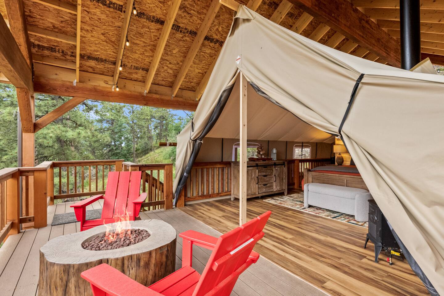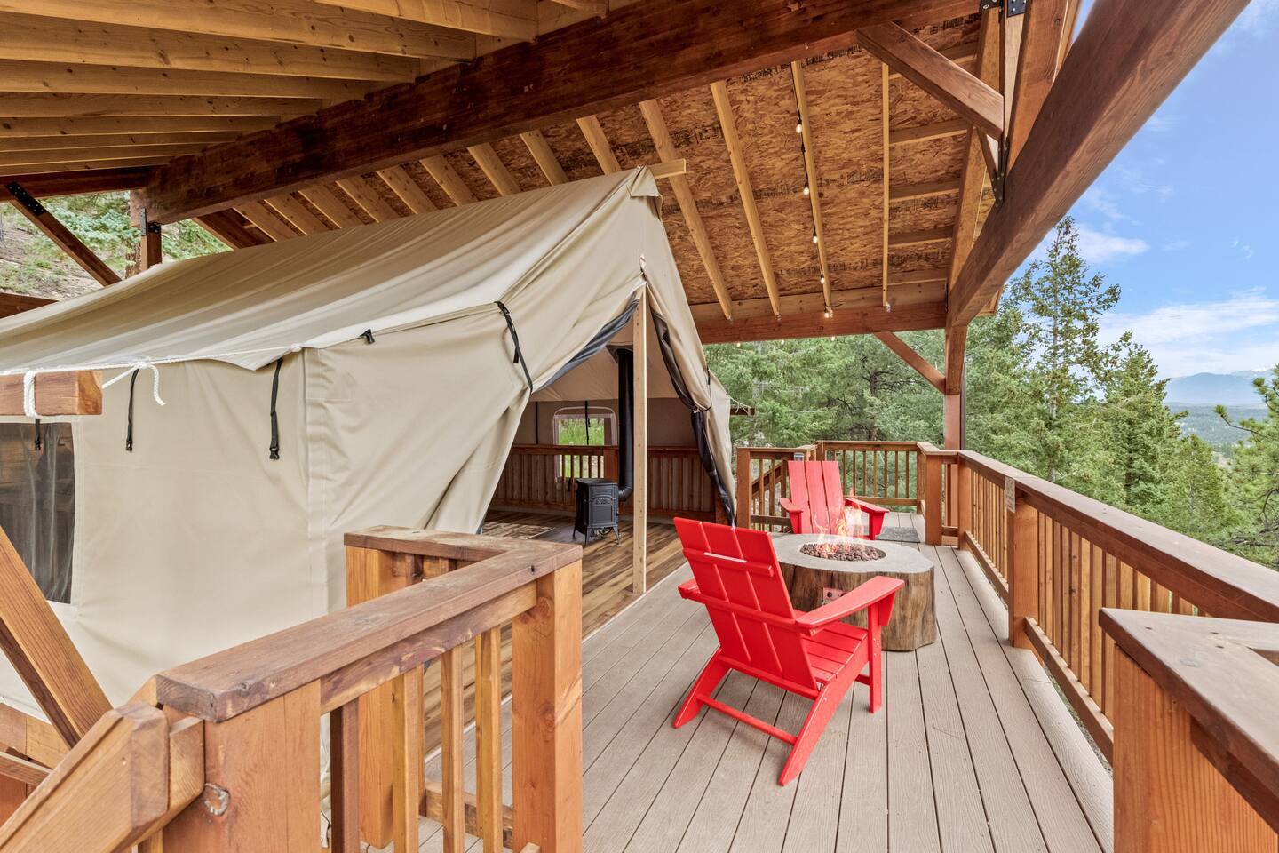 Looking for a relaxing getaway that's out of this world? Come stay at the Zen Treehouse+ Glamping Tent, a breathtaking sanctuary nestled high up in the treetops overlooking beautiful Deer Creek Valley. A unique blend of luxury, nature, and tranquility with stunning panoramic views, lush greenery, and modern amenities, your stress will leave as soon as you arrive. Your stay at Zen Treehouse will rejuvenate your mind, body and spirit. Sleeps up to eight and only an hour from Denver.